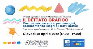 Il Dettato Grafico: costruiamo una storia per immagini (laboratorio artistico online) Professional Academy Scuola 06 Apr 2022Il WebLab è un laboratorio artistico online, accreditato MIUR (4 ore) e rivolto a docenti, educatori e insegnanti per supportarli nella progettazione di attività, volte ad introdurre in classe il dettato grafico, in grado di promuovere la capacità di riprodurre stimoli differenti, attraverso la sperimentazione di diversi tratti e segni grafici. Quota d’iscrizione individuale: € […]+ Continua