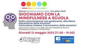 Giochiamo con la MINDFULNESS a SCUOLA per imparare a gestire le emozioni e comunicare senza giudicare (Laboratorio pratico didattico online) Professional Academy Scuola 12 Apr 2022Il WebLab è un laboratorio artistico online, accreditato MIUR (4 ore) e rivolto a docenti, educatori e insegnanti per supportarli nella progettazione di attività basate sulla metodologia della MINDFULNESS, per gestire e riconoscere le emozioni, allenare l’intelligenza emotiva, la capacità di condivisione di gruppo e la comunicazione non giudicante. Quota d’iscrizione individuale: € 35,00 (IVA […]+ Continua