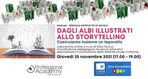 Dagli albi illustrati allo storytelling Professional Academy Azienda 04 Nov 2021Il WebLab è un laboratorio artistico online, accreditato MIUR (4 ore) e rivolto a docenti, educatori e insegnanti, per accompagnarli nella realizzazione di un progetto di storytelling, partendo dalla lettura di uno o più albi illustrati. Quota d’iscrizione individuale: € 35,00 (IVA esente) OFFERTA LIMITATA: SCONTO 15% per iscrizioni entro lunedì 15 novembre 2021 (Offerta […]+ Continua