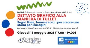 Il dettato grafico alla maniera di Tullet: segni‚ linee‚ forme e colori per creare una storia per immagini (laboratorio artistico online) Professional Academy Scuola 20 Apr 2023Il WebLab è un laboratorio didattico-artistico online, accreditato MIUR (4 ore), per progettare attività volte a introdurre in classe il dettato grafico, prendendo come spunto gli albi illustrati e le tecniche di Hervé Tullet, al fine di promuovere la capacità di riprodurre stimoli differenti, mediante la sperimentazione di diversi tratti e segni grafici. Quota d’iscrizione […]+ Continua
