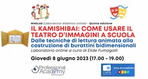 Kamishibai: utilizzare il teatro d’immagini per creare proposte didattiche (Laboratorio online) Professional Academy Scuola 11 Mag 2023Il WebLab è un laboratorio artistico online, accreditato MIUR (4 ore) e rivolto a docenti ed educatori per supportarli nella progettazione di laboratori di lettura animata e partecipativa attraverso il Kamishibai. Questo metodo permette di introdurre, in maniera semplice e immediata, l’arte narrativa e l’arte teatrale, già dai primi anni di scuola. Quota d’iscrizione individuale: […]+ Continua