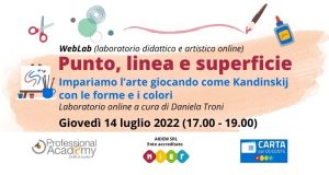 Da un punto allo spazio: weblab artistico alla maniera di Kandinskij per lo sviluppo della creatività e l’apprendimento dei concetti topologici Professional Academy Scuola 09 Giu 2022Il WebLab è un laboratorio artistico online, accreditato MIUR (4 ore) e rivolto a tutti i docenti, gli educatori e gli insegnanti che vogliono scoprire i molteplici linguaggi e i temi della ricerca artistica contemporanea e imparare a utilizzarli all’interno di attività laboratoriali. Quota d’iscrizione individuale: € 35,00 (IVA esente) OFFERTA LIMITATA: SCONTO 15% per […]+ Continua