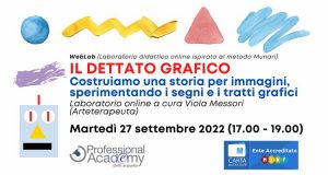 Il Dettato Grafico: segni, tratti, forme e colori per costruire una storia per immagini (laboratorio artistico online) Professional Academy Scuola 31 Ago 2022Il WebLab è un laboratorio artistico online, accreditato MIUR (4 ore), per supportare i docenti e gli educatori nella progettazione di attività volte ad introdurre in classe il dettato grafico, al fine di promuovere la capacità di riprodurre stimoli differenti, attraverso la sperimentazione di diversi tratti e segni grafici. Quota d’iscrizione individuale: € 35,00 (IVA […]+ Continua