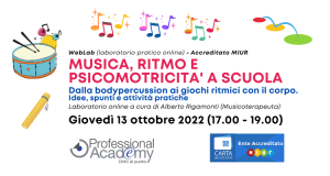 MUSICA, RITMO E PSICOMOTRICITA’ A SCUOLA: ULTIMI POSTI (Laboratorio artistico online) Professional Academy Scuola 06 Ott 2022Il WebLab è un laboratorio artistico online, accreditato MIUR (4 ore) e rivolto a docenti, educatori e insegnanti, per supportarli nella progettazione di attività pratiche che consentano agli alunni di acquisire maggiore consapevolezza del proprio corpo e di come questo possa comunicare, anche senza parole, attraverso il ritmo e la musica. La musica è un […]+ Continua