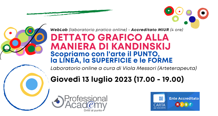 WebLab (Laboratorio didattico-artistico online) – Accreditato MIUR (4 ore)IL DETTATO GRAFICO ALLA MANIERA DI KANDINSKIJScopriamo con l’arte il punto, la linea, la superficie e le formeQuando: giovedì 13 luglio 2023Orario: 17.00 – 19.00Docente: Viola Messori (Arteterapeuta ed educatrice professionale in ambito sanitario. Esercita la libera professione come arteterapeuta all’interno di una équipe multiprofessionale e ha maturato esperienze in questo campo in diverse scuole della provincia di Mantova e all’interno delle Case Circondariali di Mantova e Cremona)