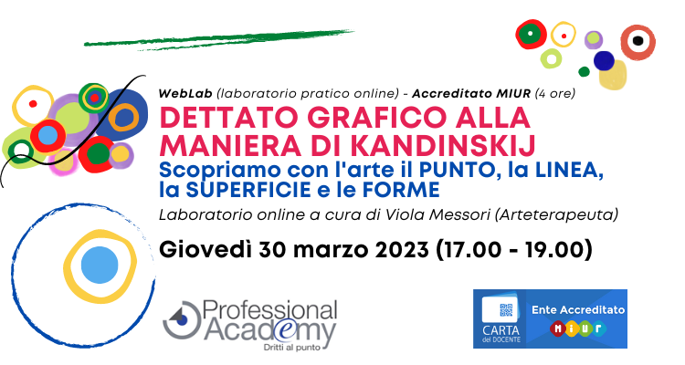 WebLab (Laboratorio didattico-artistico online) – Accreditato MIUR (4 ore)IL DETTATO GRAFICO ALLA MANIERA DI KANDINSKIJScopriamo con l’arte il punto, la linea, la superficie e le formeQuando: giovedì 30 marzo 2023Orario: 17.00 – 19.00Docente: Viola Messori (Arteterapeuta ed educatrice professionale in ambito sanitario. Esercita la libera professione come arteterapeuta all’interno di una équipe multiprofessionale e ha maturato esperienze in questo campo in diverse scuole della provincia di Mantova e all’interno delle Case Circondariali di Mantova e Cremona)