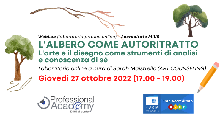 WebLab (Laboratorio didattico-artistico online) – Accreditato MIUR (4 ore)L’ALBERO COME AUTORITRATTOL’arte e il disegno come strumenti di analisi e conoscenza di séQuando: giovedì 27 ottobre 2022Orario: 17.00 – 19.00Docente: Sarah Maistrello (Art Counseilor Laureata al D.A.M.S indirizzo Arte e Master triennale in artcounseling presso A.S.P.I.C di Roma, da una quindicina di anni propone laboratorio artistici finalizzati alla conoscenza e all’apertura di spazi creativi dentro di sé)