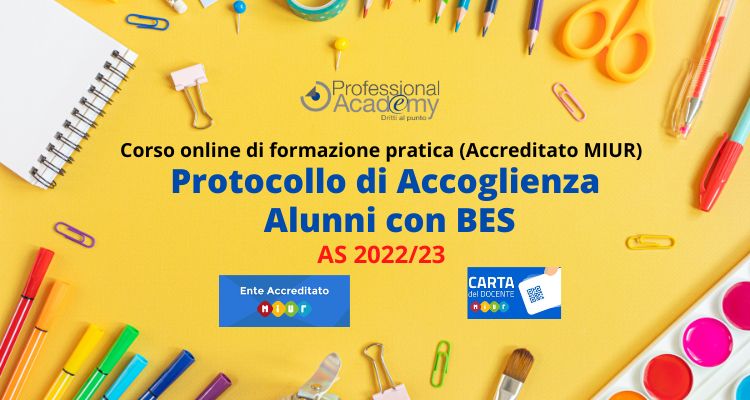 Corso online, accreditato MIUR e costituito da 4 lezioni (dispense, video, slides, esempi, esercitazioni, questionari intermedi), per supportare i docenti a predisporre e attuare le procedure di accoglienza e accoglienza di alunni con BES, attraverso modelli, esempi di Protocollo, schede operative di rilevazione e checklist.