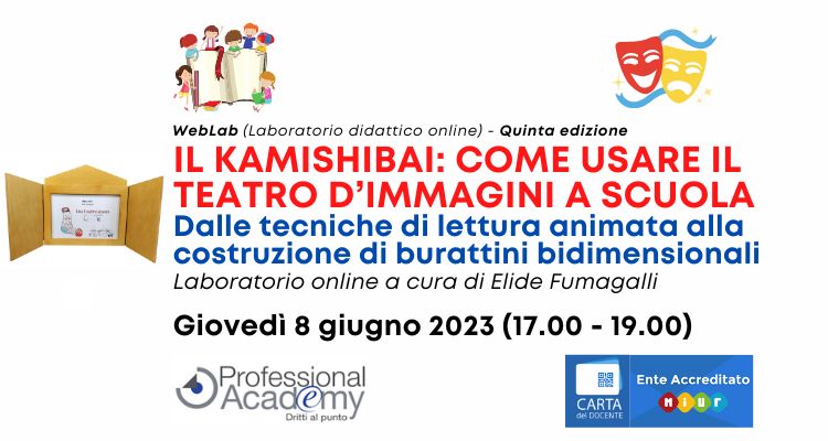 WebLab (Laboratorio didattico-artistico online) – Quinta edizioneIL KAMISHIBAI: COME USARE IL TEATRO D’IMMAGINI A SCUOLADalle tecniche di lettura animata alla costruzione di burattini bidimensionaliQuando: giovedì 8 giugno 2023Orario: 17.00 – 19.00Docente: Elide Fumagalli, formatrice, scrittrice, illustratrice. Ha fondato la casa editrice Vivo di Fiabe, specializzata in libri per Kamishibai. Ha inoltre creato il Kamishibook ®, una rielaborazione dell’antico metodo di lettura giapponese adattandolo alla realtà scolastica della primaria e dell’infanzia. Vincitrice del Premio “Andersen baia delle favole”, del Premio “Il paese delle fiabe” (rivista Andersen) e del Premio “Un prato di Fiabe”.