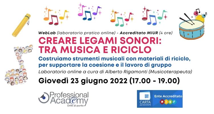 CREARE LEGAMI SONORI: TRA MUSICA E RICICLOCostruiamo strumenti musicali con materiali di riciclo, per supportare la coesione e il lavoro di gruppoQuando:giovedì 23 giugno 2022Orario: 17.00 – 19.00Docente: Alberto Rigamonti, Musicoterapeuta specializzato in Musicoterapia Neurologica, Dottore in scienze e tecniche psicologiche. Svolge attività di musicoterapia e comunicazione sonora presso Istituti Comprensivi Statali e sessioni individuali con bambini, ragazzi e adulti con difficoltà cognitive, motorie e relazionali.