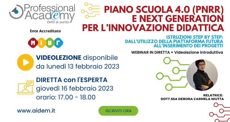 Webinar Accreditato dal MIUR(Videolezioni + Question Time in diretta con la docente)PIANO SCUOLA 4.0 (PNRR) e NEXT GENERATION per l’innovazione didatticaIstruzioni step by step: dall’utilizzo della piattaforma Futura all’inserimento dei progettiOFFERTA LIMITATA: SCONTO 15% per iscrizioni entro il 1° febbraio 2023Relatrice: Dott.ssa Debora Carmela Niutta, docente e formatore professionale, animatore digitale, membro dell’ecosistema STEAM di Verona e dintorni, mentor CoderDojo Verona, Ambassador Kid Game Jam, Leading Teacher European Code Week. Ha ideato vari eventi sull’innovazione nell’educazione. Si occupa di formazione in tutta Italia e all’estero su Coding, Robotica, STEAM, Microsoft 365, Piattaforme per didattica a distanza e didattica digitale integrata, Inclusione e tecnologie.